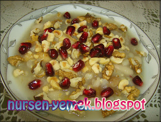 Aşure zamanı geçti arkadaşlar ama,yayınlamak istediğim tarifler vardı,bilgisayarım arızalandı derken bu güne geldim.Aşuremin fotoğrafı masum masum bana bakarken başka bir tarif eklemekte gelmedi içimden.Bana aşure yapması çok kolay gelir.Dondurucumda her zaman haşlanmış nohut ve kuru fasulye bulunur,aklıma esince 'haydi bir aşure kaynatayım' derim. Allahtan evdekilerde benim gibi çok severler.Neyse lafı çok uzatmayayım,işte tarifi.